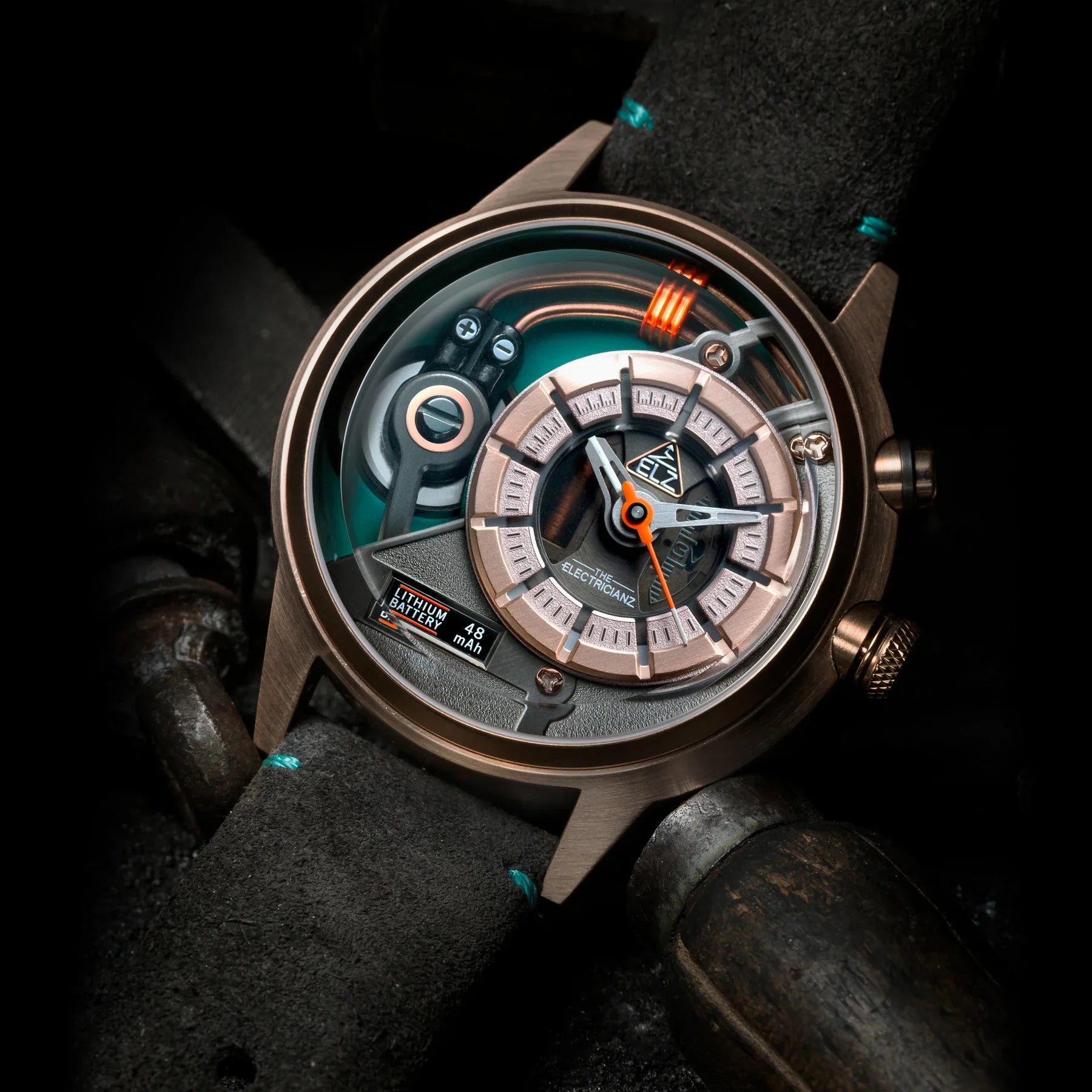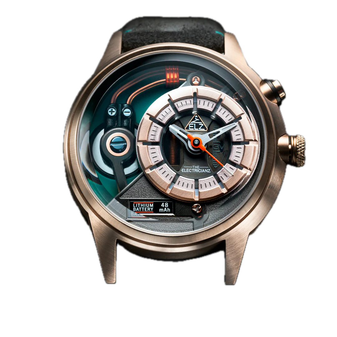 Matte roségouden wijzerplaat. Groene kast. Matte zilveren uurwijzer, matte zilveren minutenwijzer, oranje secondewijzer met witte kop. 5x LED-lichtfunctie (1,5A). Warm LED-licht.