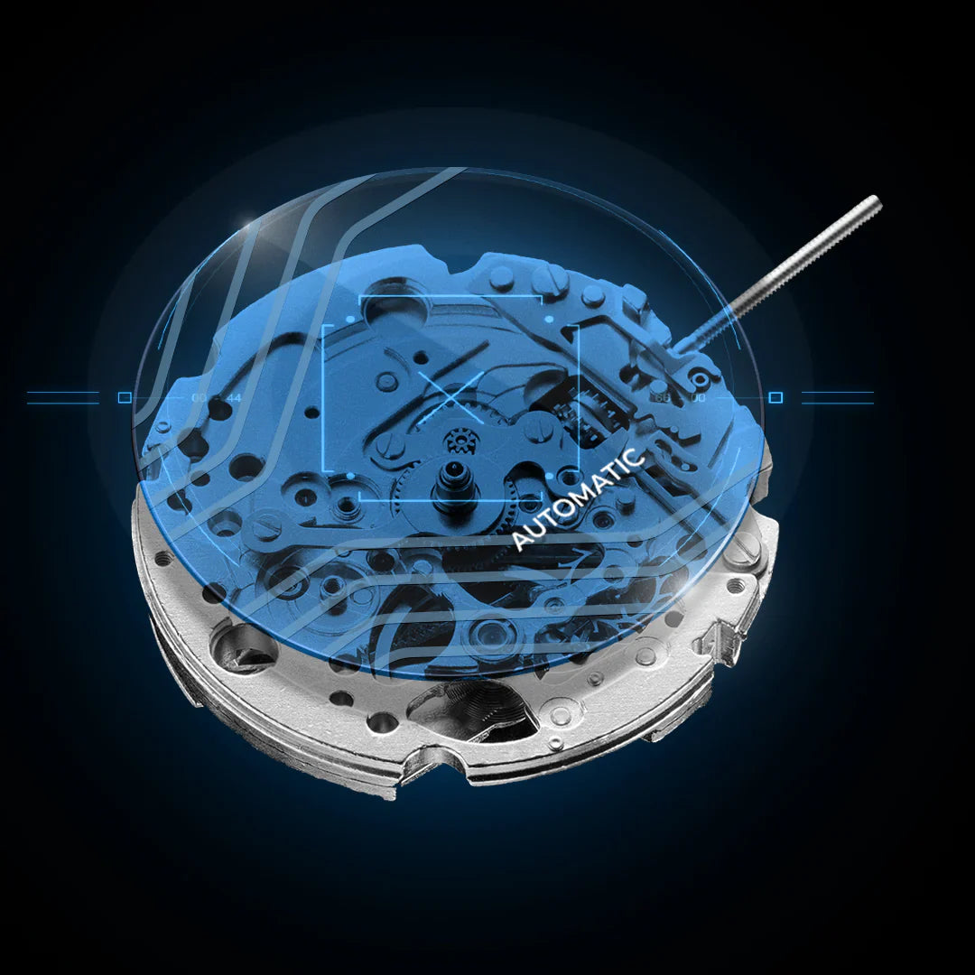 Gekoppeld aan een Miyota 82S0 mechanisch uurwerk