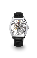 Roestvrijstalen kast, 40 mm op de 3/9-as, handopwindbaar, skelet, saffierglas bovenop, kristallen achterkant, leren band, zilver/zwart uurwerk