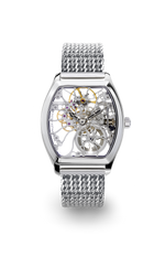 Roestvrijstalen kast, 40 mm op de 3/9-as, handopwindbaar, skelet, saffierglas bovenop, kristallen achterkant, leren band, roze/zilveren uurwerk