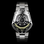 De kast van SPACESHIP bestaat uit drie stukken roestvrij staal van 316L, elk zorgvuldig vervaardigd en onderworpen aan meer dan 60 processen, wat meer dan 180 dagen in beslag neemt om perfectie te bereiken. Elke decoratieve lijn op de kast vereist nauwkeurig handpolijsten om een verbluffende afwisselend glanzende en matte afwerking te creëren.