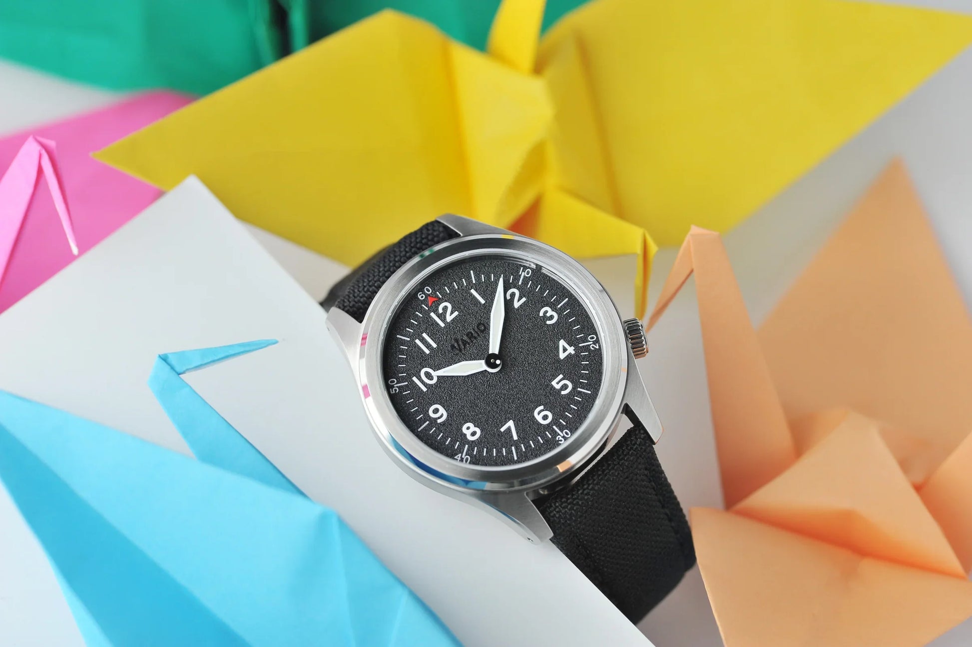 Het Vario 1945 A-11S horloge combineert geschiedenis met een vredesboodschap. De centrale secondewijzer van de iconische, in Amerika ontworpen A-11 bracht een revolutie teweeg in de nauwkeurige tijdmeting, waardoor soldaten hun acties konden synchroniseren tijdens cruciale manoeuvres op het slagveld. De vervanging van de centrale secondewijzer van het 1945 A-11S Solar Quartz horloge door een eenvoudige schijf en een contrasterende stip stelt de drager in staat de tijd te observeren en tegelijkertijd het loslaten van de oorlogswapens te symboliseren. De 1945 A-11S is een symbool van de-escalatie, geïnspireerd door de hoop op een vreedzame toekomst die Sadako Sasaki voor ogen had met haar duizend origami kraanvogels.